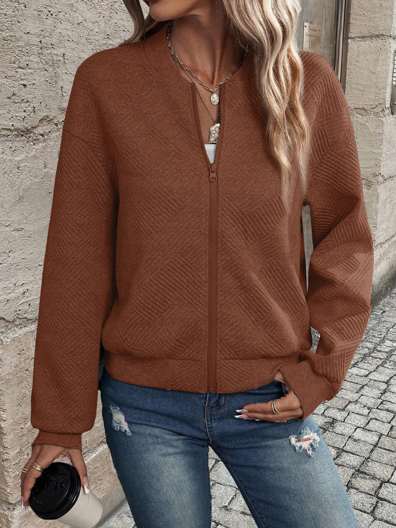 Home / Womenwear / New Fashionable Plaid Zipper Round Neck Long Sleeve Jacket Women